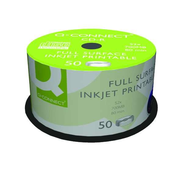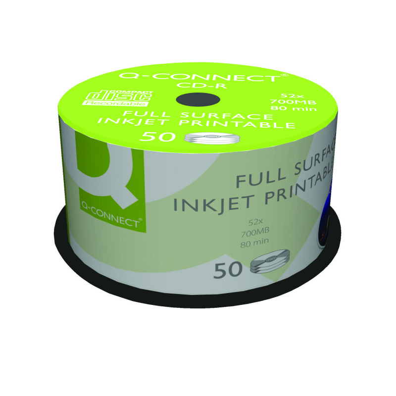Supplied on a spindle of 50 discs, Q-Connect CD-Rs are the affordable choice for creating music CDs and data backups. With a top 52x write speed and standard 700MB capacity, they're perfect for backing up documents, photos and music. These discs include an inkjet printable label surface for creating a customised label with a compatible printer that can print on CDs.